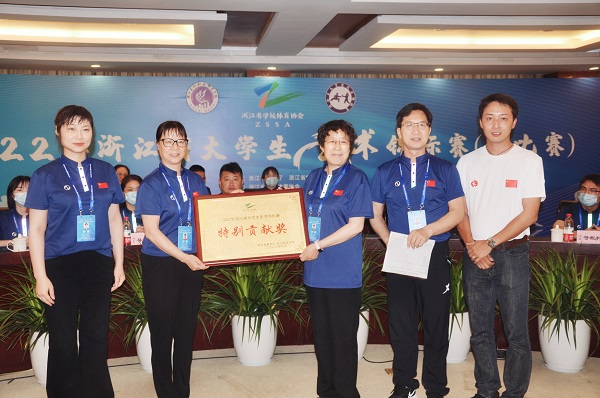 6月5日,由浙江省教育厅、浙江省体育局主办,浙江省学校体育协会执行,浙江长征职业技术学院、浙江省学校体育协会大学武术分会承办的2022年浙江省大学生武术锦标赛(云比赛)圆满落幕!比赛为期5天,我校共获四块金牌、三块银牌、两块铜牌、两个第五名、一个第六名、男子团体第二名、女子团体第六名的好成绩,俞特老师获甲组优秀裁判员、乙组优秀教练员,杨淼同学获“优秀运动员”称号,除此之外,校代表队获“体育道德风尚奖运动队”,学校获荣誉“特别贡献奖”。