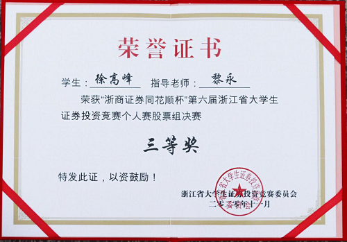 本次竞赛是浙江省教育厅主办的A类重点竞赛项目,参与人数多(7721人)、耗时长(近7个月),共分为个人赛和团体赛两部分。个人赛从2020年4月10号开始至5月25号结束,竞赛的主要内容是以股票与期货作为投资标的进行模拟实盘操作,参赛选手共计7721人,经过一个多月的拼搏,我校徐高峰同学,冲出重围,杀进了前50名,最终夺得了第六届浙江省大学生证券投资竞赛个人赛股票组三等奖!