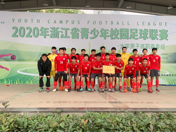 近期,由浙江省教育厅、浙江省体育局主办的2020年浙江省青少年校园足球联赛大学男子高职高专组比赛在浙江育英职业技术学院落下帷幕。经过激烈角逐,我校男子足球代表队获得了第五名的好成绩,曹永康、潘佳炜、周腾超、周鹏飞四位球员获得了优秀运动员称号。