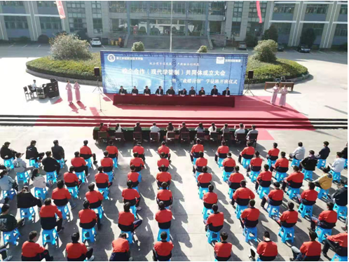 2019年11月14日,我校与浙江吉利控股集团有限公司(以下简称“吉利控股集团”)校企合作(现代学徒制)共同体成立大会——暨“成蝶计划”学徒制开班仪式在图书馆前广场举行。