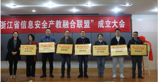 浙江省信息安全产教融合联盟是由浙江省高职和中职院校、相关行业、企业、出版社等法人单位自愿参加的全省性、 非营利集团化民间研究组织。按照“平等互利、资源共享、合作共赢、共谋发展”的原则,服务国家安全战略和“一带一路”倡议,以校企双元育人机制培养信息安全领域技术技能人才而组建的跨行业、多层次、综合性的非独立法人职教联盟。本次成立大会上,全体会员单位审议并通过联盟章程。教育厅领导共同为浙江省信息安全产教融合联盟揭牌,并向理事长单位、副理事长单位和理事单位授牌,我校成功入选浙江省信息安全产教融合联盟理事单位。会议邀请高职、中职、企业代表从校企合作、专业标准制定、人才培养、技能竞赛等方面进行经验分享和交流。