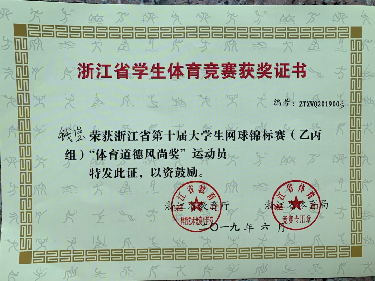 由浙江省教育厅、浙江省体育局主办的2019年浙江省第十届大学生网球锦标赛,2019年5月31日至6月6日在温州大学举办。我校运动员在基础部王晓老师的带领下参加了乙组(高职高专组)比赛。