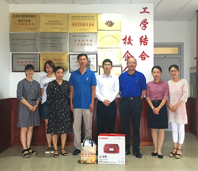 本次捐赠的教学仪器设备有佳能TS8180无线WiFi喷墨打印机一台,带录音和回放功能的新科大功率无线导游讲解话筒四台。这些教学仪器设备显著地提高了校内实训教学的质量和效率。校企合作处主任张崇利教授、管理系主任汪亚明教授、管理系党总支书记李晓梅老师,管理系旅游管理专业教师一起参与了此次捐赠仪式。