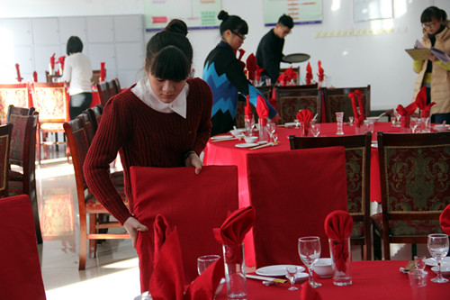 整场比赛共分为10个小组,每个小组6名选手同时开始比赛,比赛时间15分钟。比赛项目为“中餐宴会摆台”,评分内容主要包括仪容仪表、礼貌礼仪、铺台布、餐具定位、餐巾折花、操作规范等几大部分。比赛赛场和等候区分开,保证了比赛场内安静有序;在管理系党总支的支持下特别安排了计时员、核分员、摄像等工作人员,保证比赛流程顺利。
