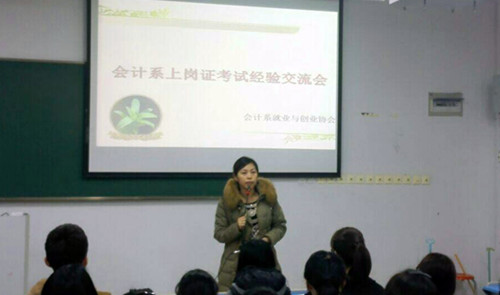 12月4日晚上6时30分,会计系就业与创业协会成功举办了“会计上岗证考试经验交流会”。会计上岗证是从事财会类工作的基本条件,会计系就业与创业协会通过这样的活动,营造努力考证的学习氛围,增强同学们考证信心,提高考证通过率,最终提高就业质量。