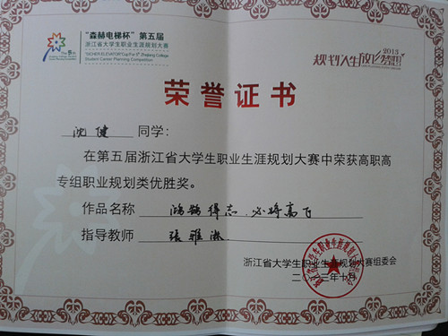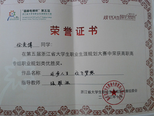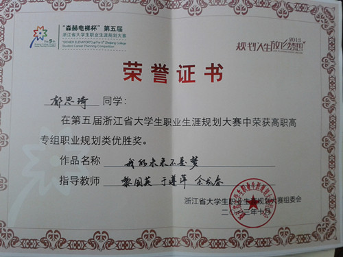 2013年10月28—31日,由浙江省教育厅主办的第五届浙江省大学生职业生涯规划大赛决赛在杭州举行。全省共有98所高校报名参加省级复赛,提交职业规划类和创业规划类参赛作品540余份。我院第一次参加该项比赛,学校有关领导高度重视此项赛事,就业创业教研室与各系部领导积极动员、精心组织,通过系部、院级选拔,共推荐5位学生参加省级复赛。经过初赛、培训、复赛等多个环节的激烈角逐,我院管理系张雅淋老师指导的三位同学的规划作品:沈健的《鸿鹄得志,必将高飞》、金跃鹏的《我拿青春赌明天》、徐亦博的《迈步人生,放飞梦想》,贸易系黎国英等老师指导的郁思琦同学的规划作品《我的未来不是梦》、于遵萍等老师指导的郭纯漂同学的规划作品《舞动我的人生》获此次比赛优胜奖。