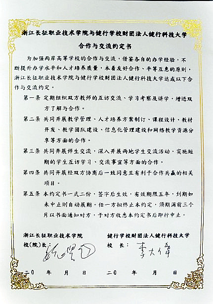 为加强两岸高等学校的合作与交流,借鉴各自的办学经验,不断提升办学水平和人才培养质量,本着友好合作、平等互惠的原则,浙江长征职业技术学院与健行学校财团法人健行科技大学签订合作与交流约定书。