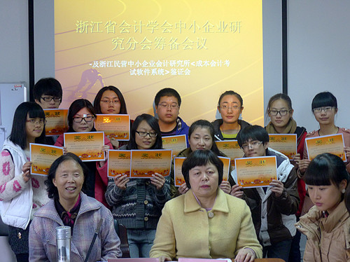 2012年12月7日下午,浙江省会计学会中小企业研究分会筹备会议暨浙江民营中小企业会计研究所《成本会计考试软件系统》研究成果鉴证会议在浙江长征职院浙江民营中小企业会计研究所(实训楼南313)举行,会议由副教授薛茹所长主持,财会学院院长高晓红教授代表学院致辞,韩锦生副教授解读了浙江省会计学会中小企业研究分会章程,徐亚明副教授、包国华教授等多位专家、学者参加了会议。本次会议就浙江省会计学会中小企业研究分会章程共八章三十四条和其它相关制度政策进行了探讨,议定了分会章程及组织机构成员;会议还为会计研究所的学生信息员颁发了聘书,为冯娟等同学颁发了优秀信息员证书;与会专家、学者还对韩锦生和薛茹副教授开发的《成本会计考试软件系统》研究成果进行鉴证并给予了高度评价。