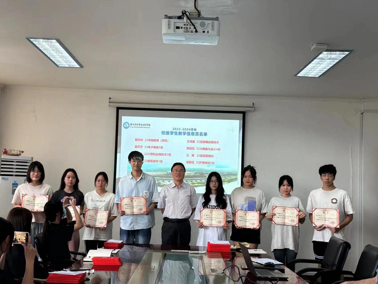 高创宽向优秀学生教学信息员代表颁发了荣誉证书。他首先代表学校对优秀学生教学信息员们2年来在信息收集、分析、上报工作中付出的努力,希望大家把积累的工作经验传授给新一批校级信息员,确保教学信息工作能够顺利、平稳、持续开展。