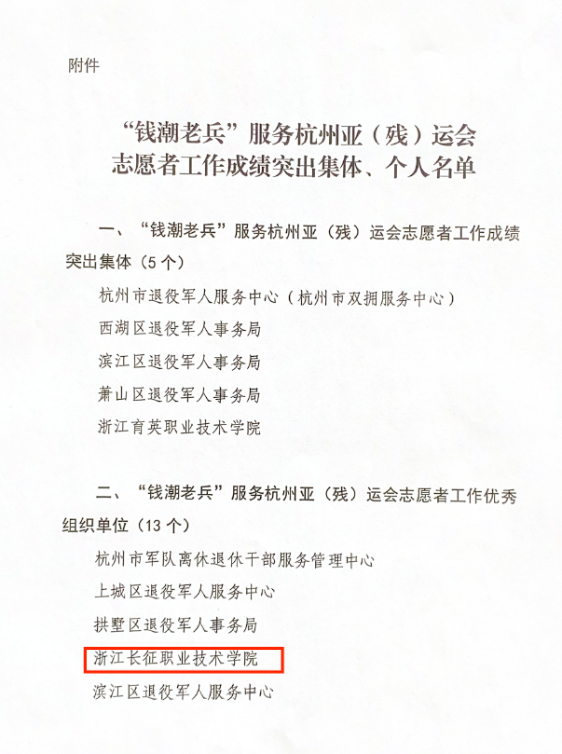 亚(残)运会举办期间,我校与西湖区退役军人事务局共组织24名“钱潮老兵”亚运志愿者,全力保障浙江大学紫金港校区体育馆、浙江工业大学屏峰校区板球馆、淳安界首体育中心场馆和千岛湖淳安会场的赛事医疗协转工作。志愿者们的优异表现得到了亚组委和社会各界人士的一致好评,体现出学校在大学生退役士兵管理和培养方面的先进性。