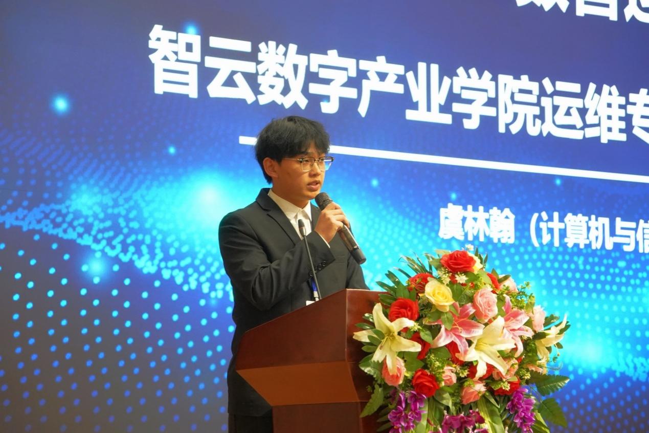 虞林翰作为运维专才班的学生代表表达了对母校提供良好学习环境的感谢、对老师的辛勤教育培养的感谢,并表示将珍惜宝贵的实习机会,努力学习专业知识,积极参与实践活动,不断提升自己的综合素质和技能水平,决不辜负学院和企业的培养及领导和老师的期望,不负青春,不负梦想。