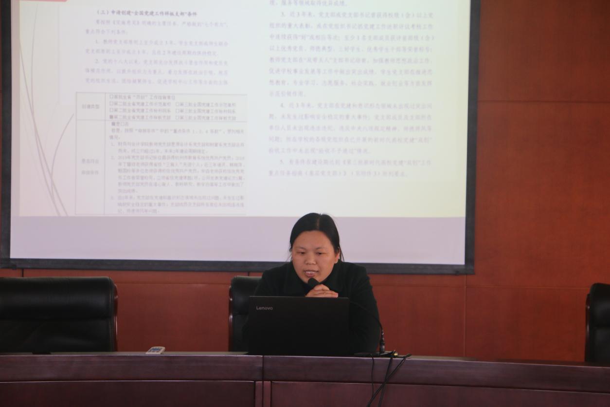 在培训环节,财务与会计学院教师党支部书记张俊霞向大家介绍了样板党支部的申报条件、组织实施、工作要求等方面的规定,并结合申报书的具体内容,从理念和目标、党员队伍建设、组织架构和职责等方面分享了财务与会计学院教师党支部在申报创建省级样板党支部方面的经验。随后,党委办公室张红老师,围绕党员发展、组织关系转接、党员教育管理、党支部标准化规范化建设等方面进行了业务培训。