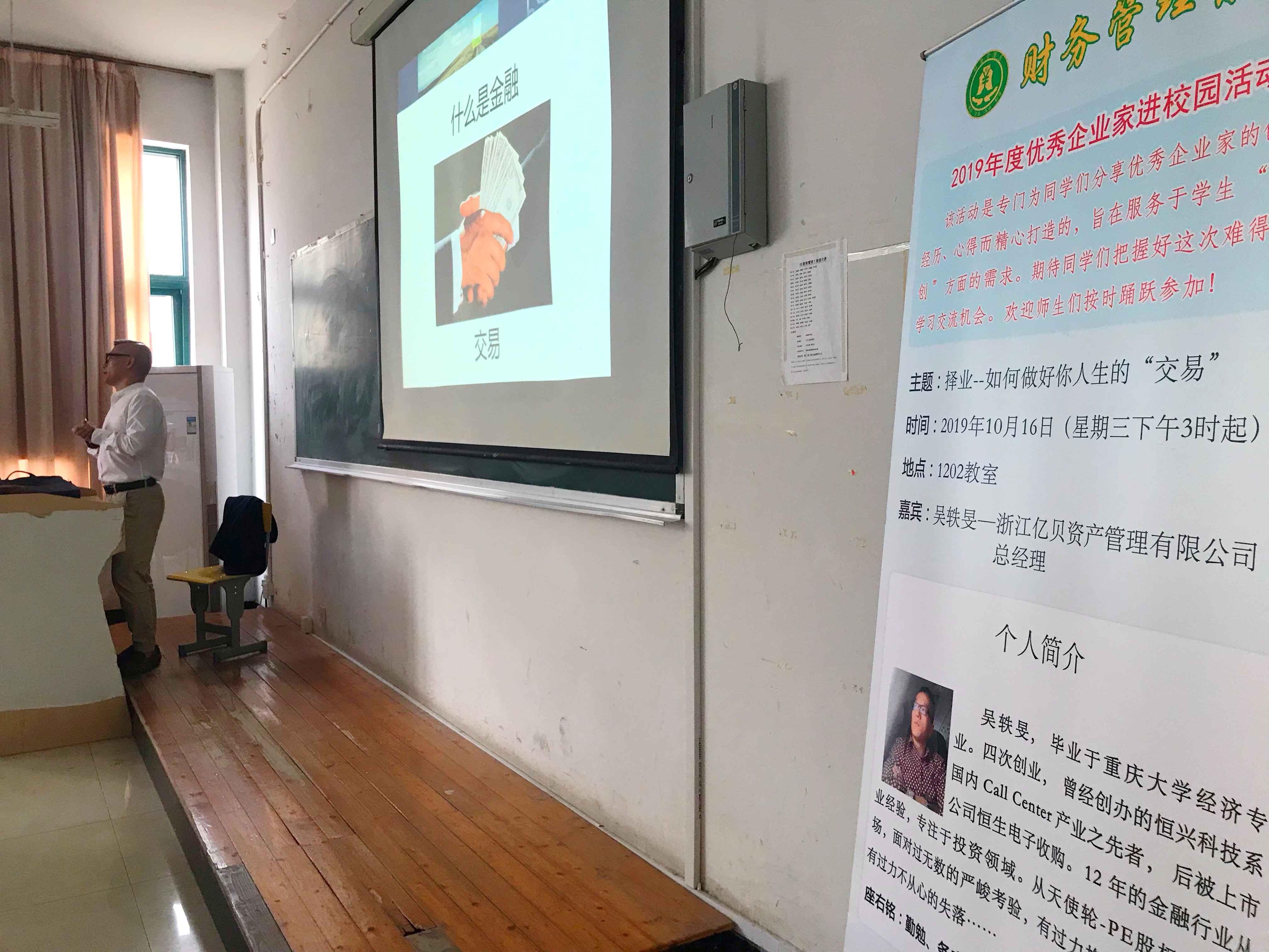 为让同学们分享优秀企业家的创业经历、心得,服务学生“三创”方面的需求。2019年10月16日下午,财务管理系邀请了浙江亿贝资产管理有限公司吴轶旻总经理,来校做了题为“择业——如何做好你人生的‘交易’”报告,报告在1202教室进行,财务管理系全体教师及学生代表到场聆听了报告。报告得到了浙江民营中小企业会计研究所及浙江省发明协会财税统计专业委员会的支持。
