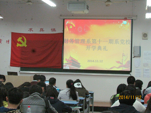2014年11月12日晚上6点,财管系第十一期业余党校开学典礼在一号教学楼1202教室举行。参加开学典礼的人员有:系党总支副书记徐静老师、辅导员翁文亮老师、党员小组、以及全体培训学员。