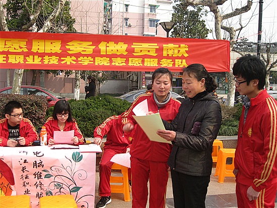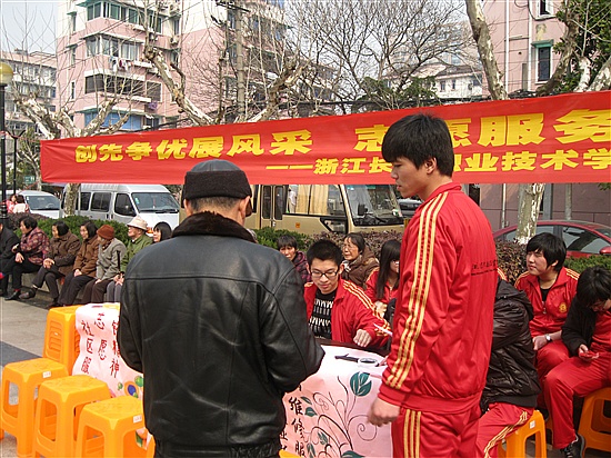 3月4日下午,在3.5雷锋日来临之际,我院15名志愿者参加了由省直机关团工委学校片和江干区采荷街道团工委共同举办的“创先争优,爱心接力”大学生志愿服务进社区活动,活动旨在鼓励我们当代大学生学好专业知识的同时发扬雷锋精神,更好地服务社会。