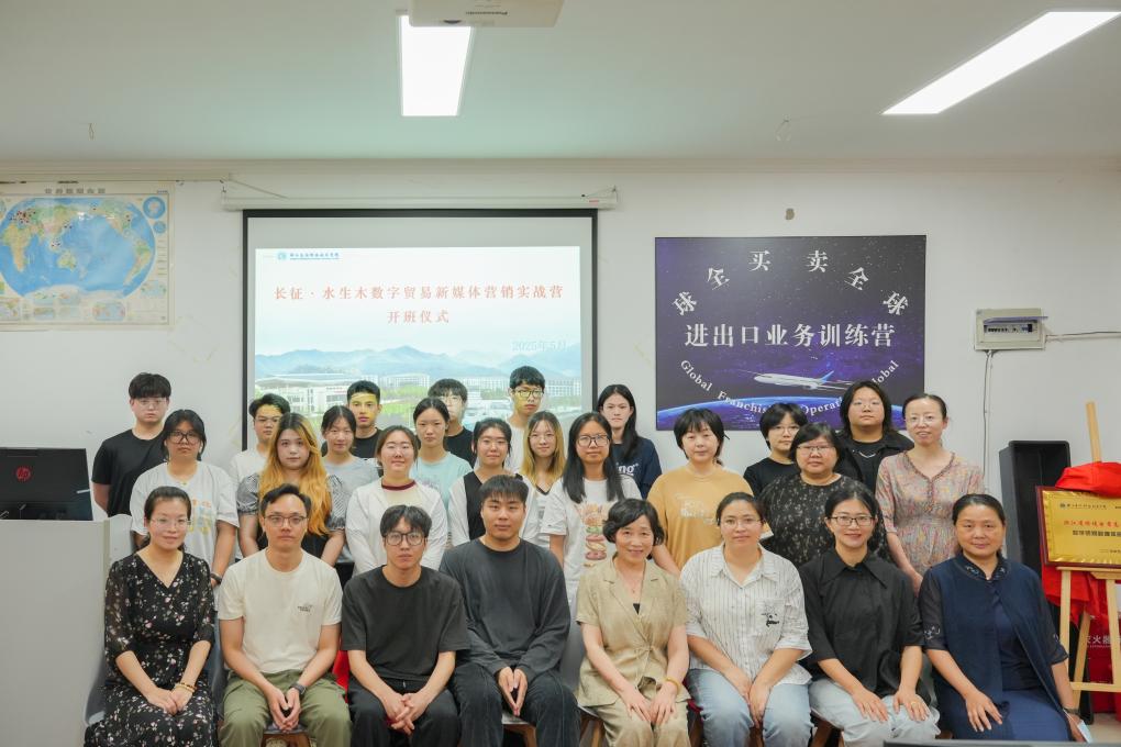 近日,商务与贸易学院与杭州水生木信息科技有限公司共建的“长征·水生木数字贸易新媒体营销实战营”项目开班仪式在实训楼南111教室成功举行。杭州水生木信息科技有限公司跨境运营经理王克俭、TIKTOK运营经理郑彪、短视频内容运营经理罗亮,商务与贸易学院院长王珍、副院长陈露,国际经济与贸易教研室全体教师及首期17名实战营学员齐聚一堂,共同见证校企合作项目落地。