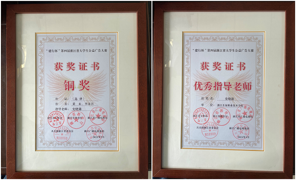 5月25日下午,第四届浙江省大学生公益广告大赛颁奖典礼在浙江广电集团隆重举行。我校商务系19市场营销2班黄未、李沛青凭借影视类作品《选择》荣获影视类铜奖,指导老师史晓懿获评为优秀指导老师。