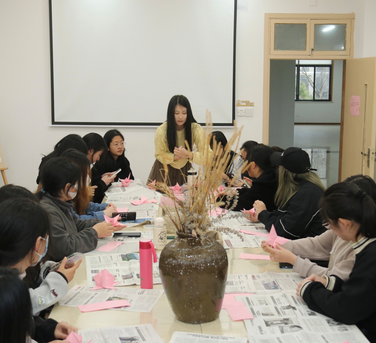 折纸花是一种简单而实用的手工艺术,鉴于大多数女生是第一次接触,活动特邀请了手作达人22级幼儿健康管理专业张静同学为大家讲解了折纸的艺术特征,介绍了纸花的制作要领,并进行现场演示。同学们充分发挥自己的想象力和动手能力,一步步制作花瓣、花蕊,废旧的报纸在灵巧的指间慢慢卷起、缠绕、折叠,一“卷”一“折”之间,一朵朵纸花跃然而现,最后定格成独具匠心和审美品质的作品。制作现场热闹而温馨,在制作过程中,师生们不仅体会到了折纸艺术独特的魅力,也感受到了变废为宝的乐趣。